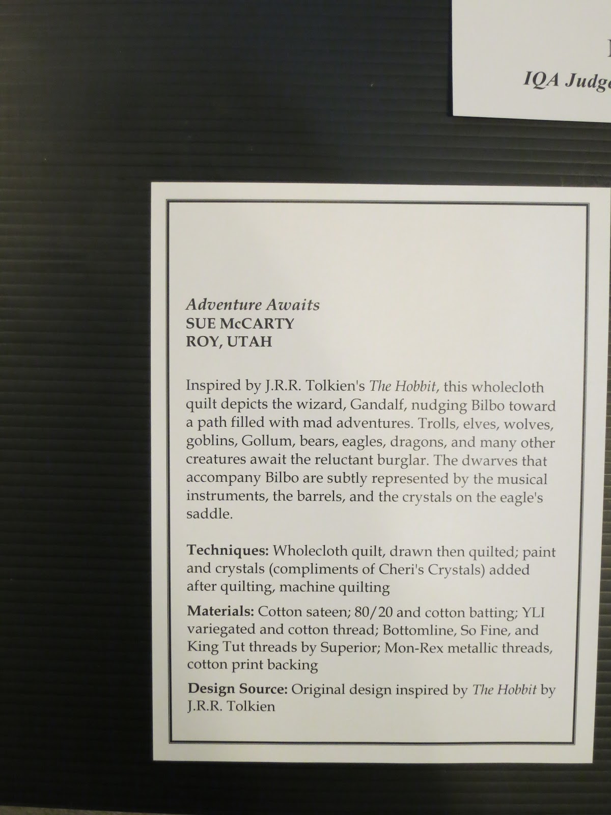 This quilt is hanging next door but one to my quilt. That’s a mixed blessing. I get to look at it a lot, which is great, but it is way too good and I’d rather is was further away from my quilt. It is called ‘Adventure Awaits’ and was quilted by Sue McCarty, it is stunning. The detail on it is just fantastic. How this quilt didn’t get in the top 3 is just beyond me. If something this amazing only gets honourable mention I can totally understand how I didn’t place. I have so many pictures of this quilt because every time I look at it I see another feature I love. I think that these gates are probably my favourite part of the quilt, but I reserve the right to change my mind.