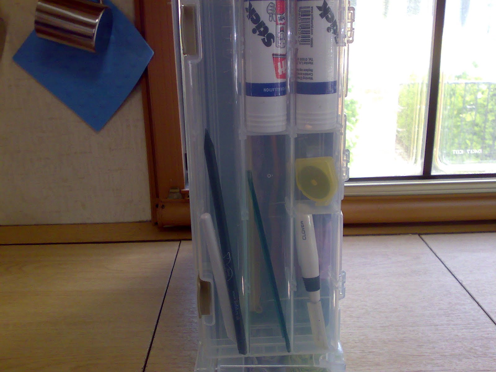 May 17, 2012I promised one of my students I would share the kit I have assembled for making my version of the summer school project. I will share drawing materials at another time this is just what I use for the sewing part. I am particularly pleased with the box everything goes in. I had been carrying the fabrics in a plastic bag which was fine until I wanted to carry a big pair of scissors. They quickly started making holes in the bag so I had to find another option. This case has a large central section where I can store my fabrics, scissors and rotary cutter. The lid lets me keep my foundations flat in a separate section. On each side of the case are small boxes with dividers perfect for the small tools.