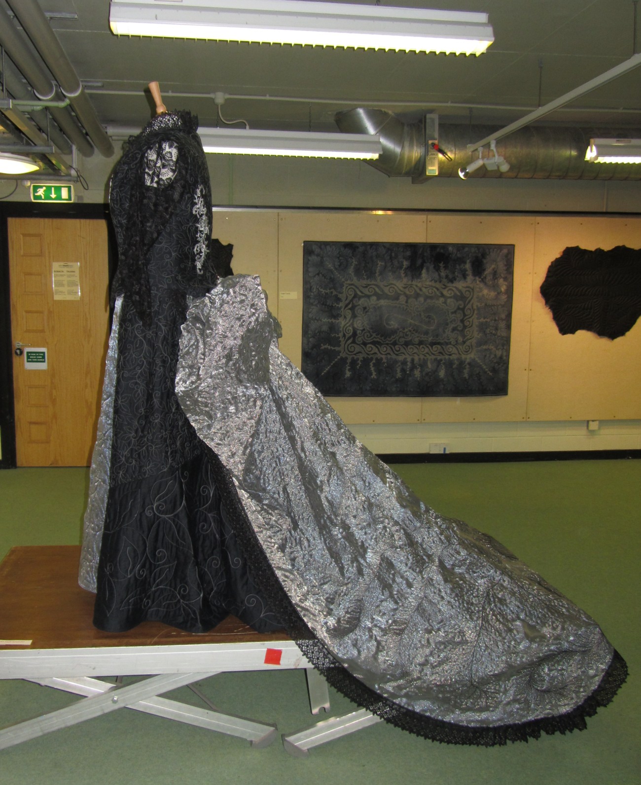 As I’ve said if I am going to make a quilted garment it has to be quilted. This gave me a problem, how could I make a proper three layer quilt that would be soft and light enough to craft the train from.  I came up with using organza. The train is three layers of organza. Silver top and bottom with black as the ‘wadding’. It is two widths of organza wide, about 80″ and approximately 120″ long. I had to guess the length as the pattern for the train went missing just as I was ready to load the organza on the train. I thought I had loaded up more than I could possible need but actually another 20″-30″ would have been good.