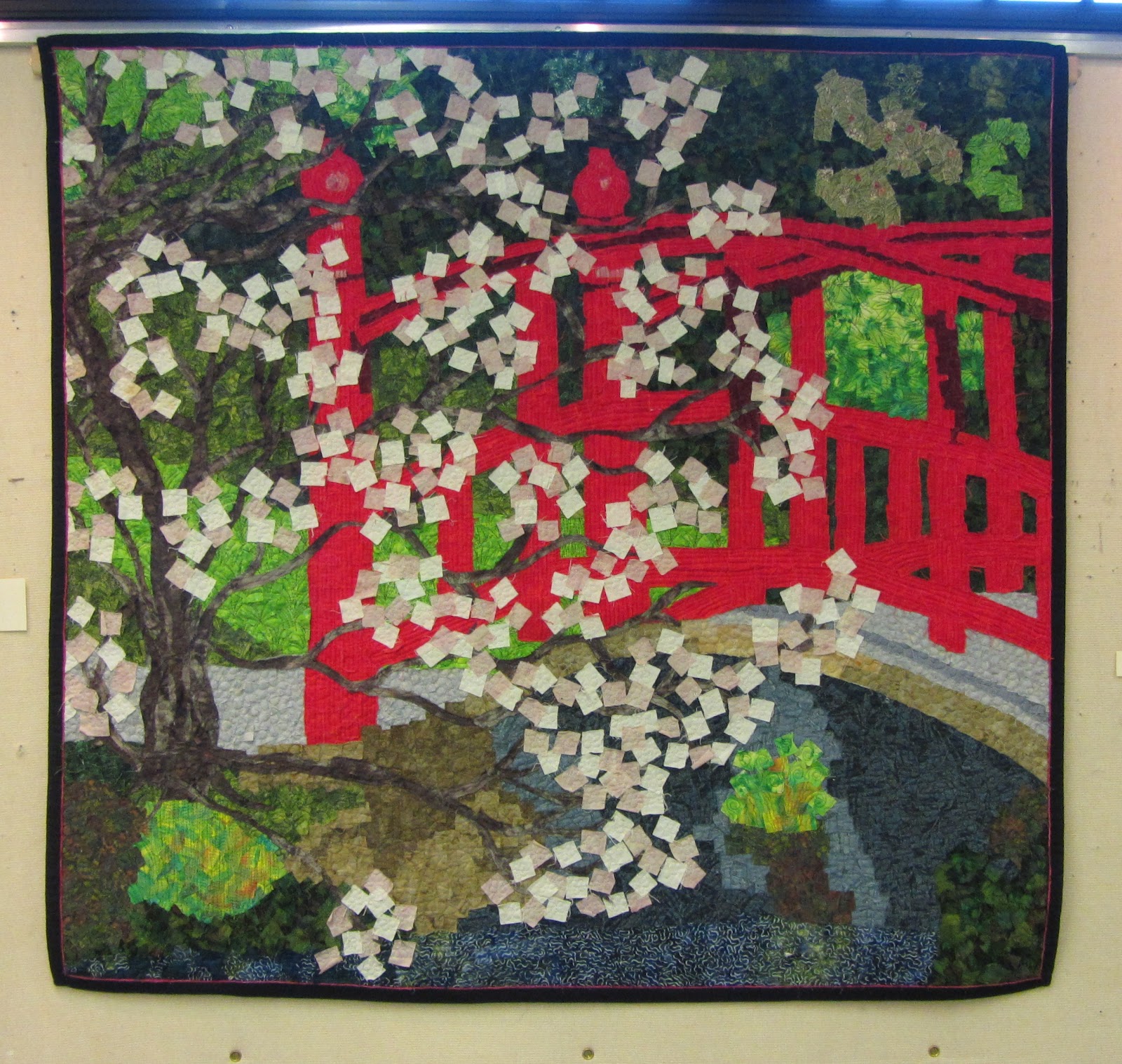 Here is another older of my older quilts. I made it to try and get a quilt into an American show. The show had the theme ‘Celebrate Spring’, and I had been spending a lot of time at the National Gallery. Cherry blossom in an impressionist style seemed the obvious choice. This was another quilt that took me out side of my comfort zone and had me trying new things. I loaded the frame with a calico backing a layer of 80/20 wadding and another layer of calico. On the calico I marked where the bridge path and river needed to go, then I started colouring in.
