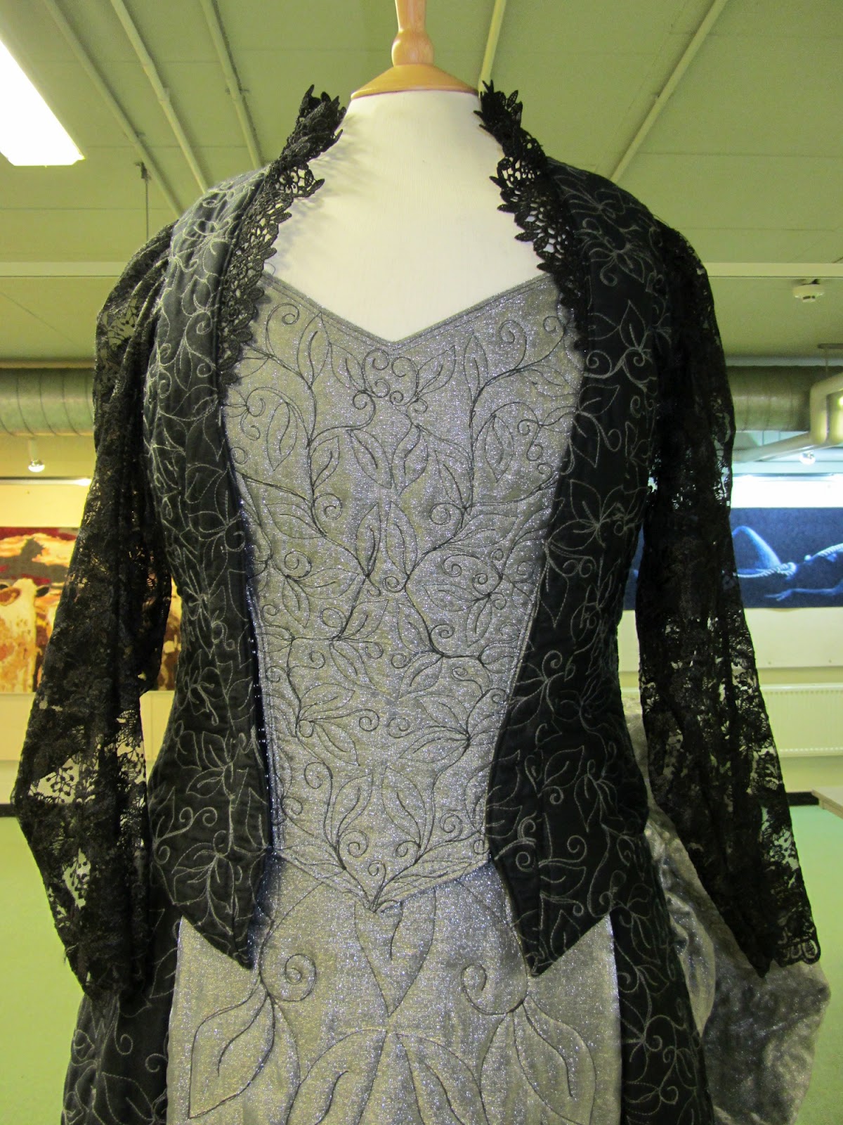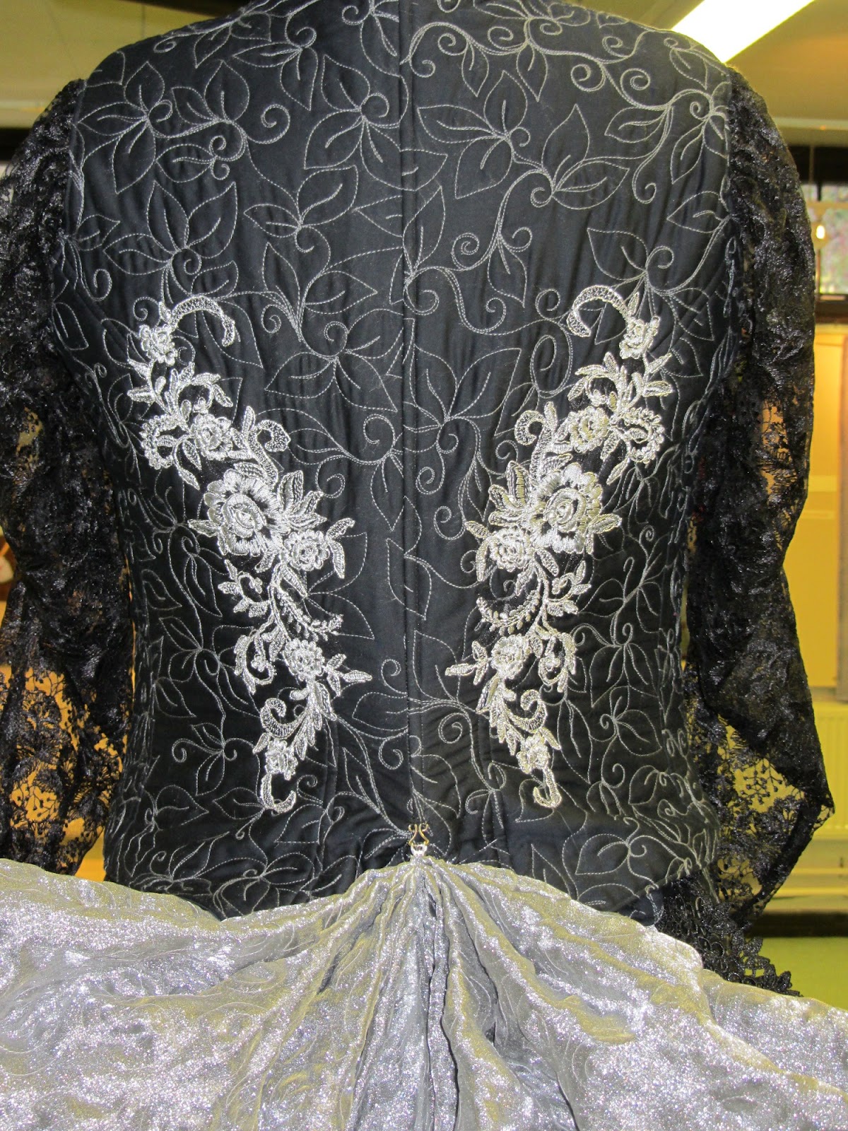 The top of the skirt and the black areas of the bodice were yardage I quilted before cutting the panels. They are quilted with and all over leaf and vine pattern. The front panel of both the bodice and the skirt and bodice are the same three layers as the rest of the garment but with an added layer of silver organza over the top.