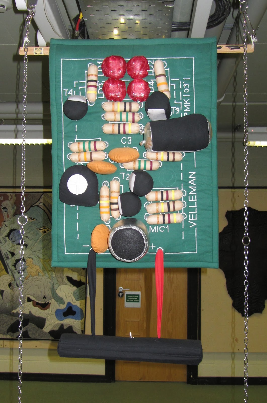 The resistors are not only the correct values, they are also the same way round as they are on the board. Yes, very sad and pedantic. The back of the quilt shows the tracks of the board and the solder spots. It is the hardest ‘soldering’ I have ever done. Hand stitching this silver fabric was a bear.