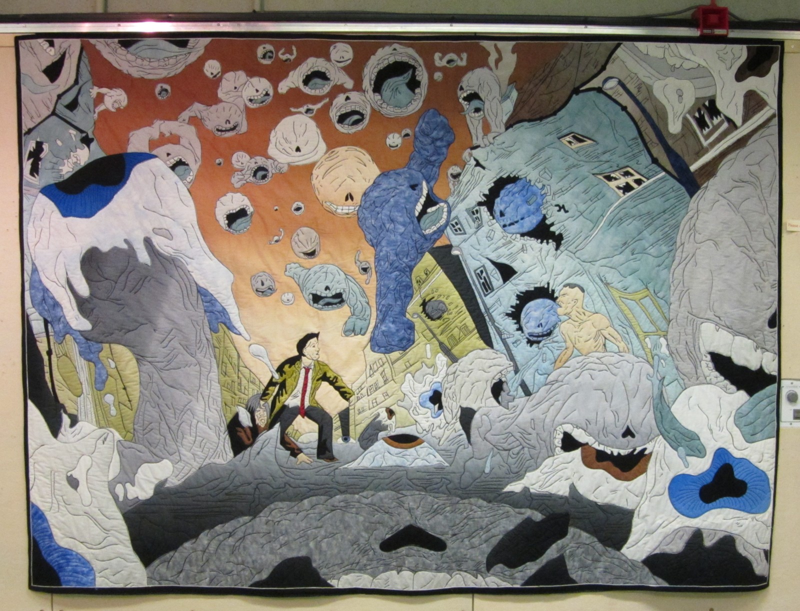 Bad Rain is another quilt that hasn’t done many quilt shows. It’s too big to ship easily (it HAS to be rolled) so the US shows are out and even UK shows are difficult if I can’t hand deliver it. On the other hand it has made it out to a few comics events and it has been very well received. I wasn’t sure how people would react to it when we came up with the idea but it seemed daft not to try displaying it, if nothing else it is a huge advertising banner. I didn’t need to worry. As it turns out comics events might be a very good place to introduce younger people to quilting. I supposed it’s just another form of art and the people at these events are already interested in graphic novels so why not. Now I just need to fit another dozen hours in the day to follow that idea up…
