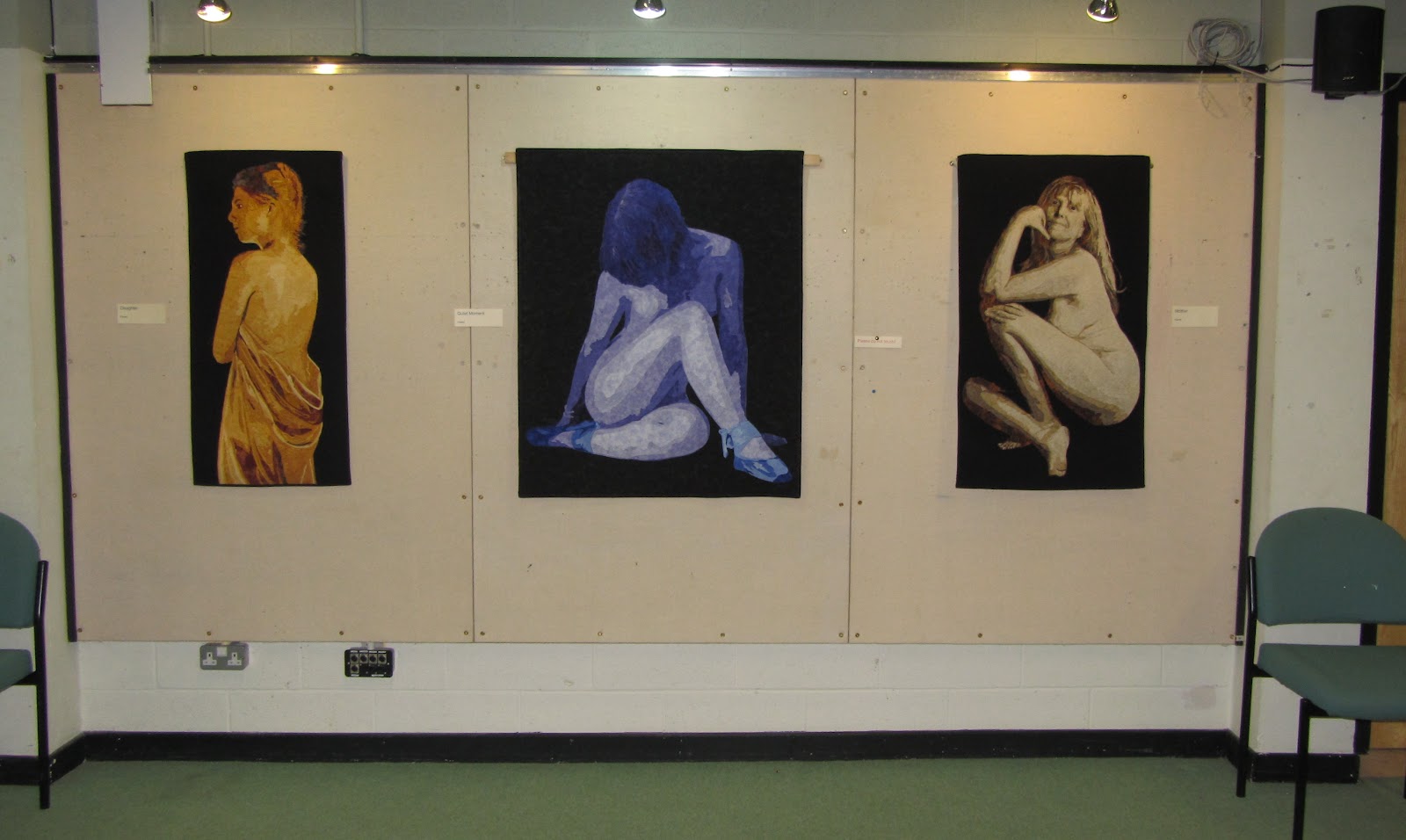 Stepping back we can see the whole of the wall between the gallery and the man hall. The main hall is only used by Quiltsfest on trading day, and for access by staff on the other days. One day the display of nudes nearly caused and accident. A workman had come in to help us out and on the way in saw fairly traditional quilts. On his way back out of the door he got somewhat distracted by the display on this wall. I would have felt guilty if he had actually failed to find the door, but I do like to surprise people. Quilting is so much more than most people think. We were also lucky enough to have a painter visit the gallery. To be fair he was literally visiting the gallery, not my show. He is having a show there soon and wanted to plan where he would hang his work. He was so positive about my work, it really made my day. When I thought about what he had said I was even more thrilled. The most important thing he said, which I didn’t realise until after he left was when I said I can’t paint, his reply was I can’t cut and sew fabric. I’d never looked at it like that. The biggest boost to my confidence in a long time. I hope his show is a huge success.