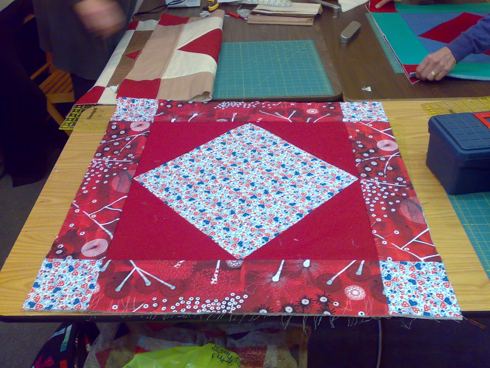 For various reason a few of the ladies had to leave early but as you can see a lot was achieved. These are the hardy ones who stayed to the bitter end. I suspect the pastel flowery one will be finished by now as she only had 2 more pieces to sew on and they were prepared ready to go. I actually thought she might have completely finished it in the class, it was a very close thing.