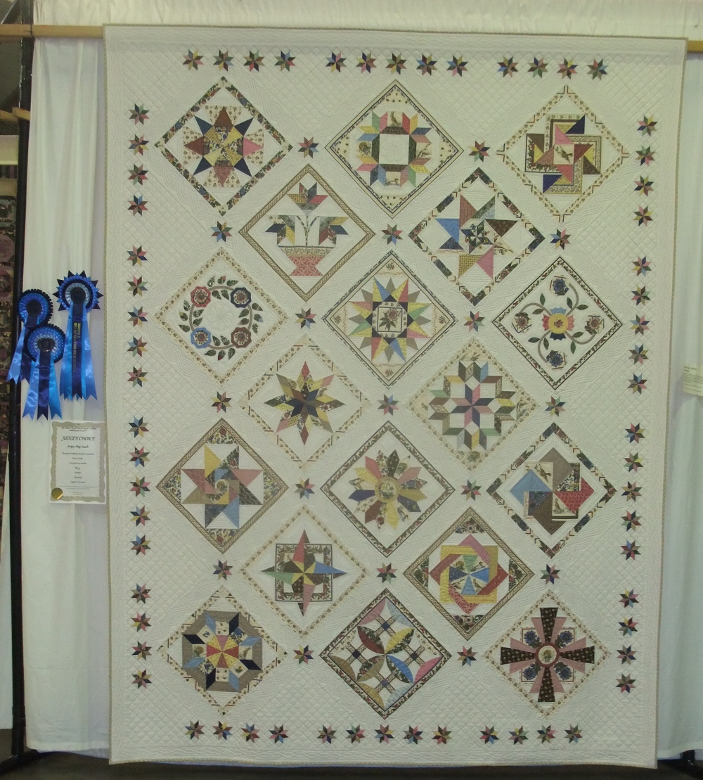 It’s not often I am so pleased by the judges choice of Championship quilt, but this year there have been two winners that really pleased me. Unfortunately at Sandown one of those beat this one, but all’s well that ends well, it’s made it this time. The quilt is called ‘Overleaf’ and was made by Susie Corke. I just love this quilt. I’m a sucker for stars anytime and small beautifully pieced ones are even better. I’m also a huge fan of sampler quilts (hence Ferreting Around) and on point settings, especially when I don’t have to quilt them.