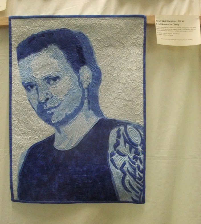 The portrait is “A brief moment of clarity. It is of a friend of mine who is also the writer of Cancertown, the graphic novel that inspired the quilt “Bad Rain”. I had hoped this might picked up and award but I had forgotten it wasn’t in a specific art quilt category, that does make a difference. It did also mean the small wall hanging category was larger than I would have expected.