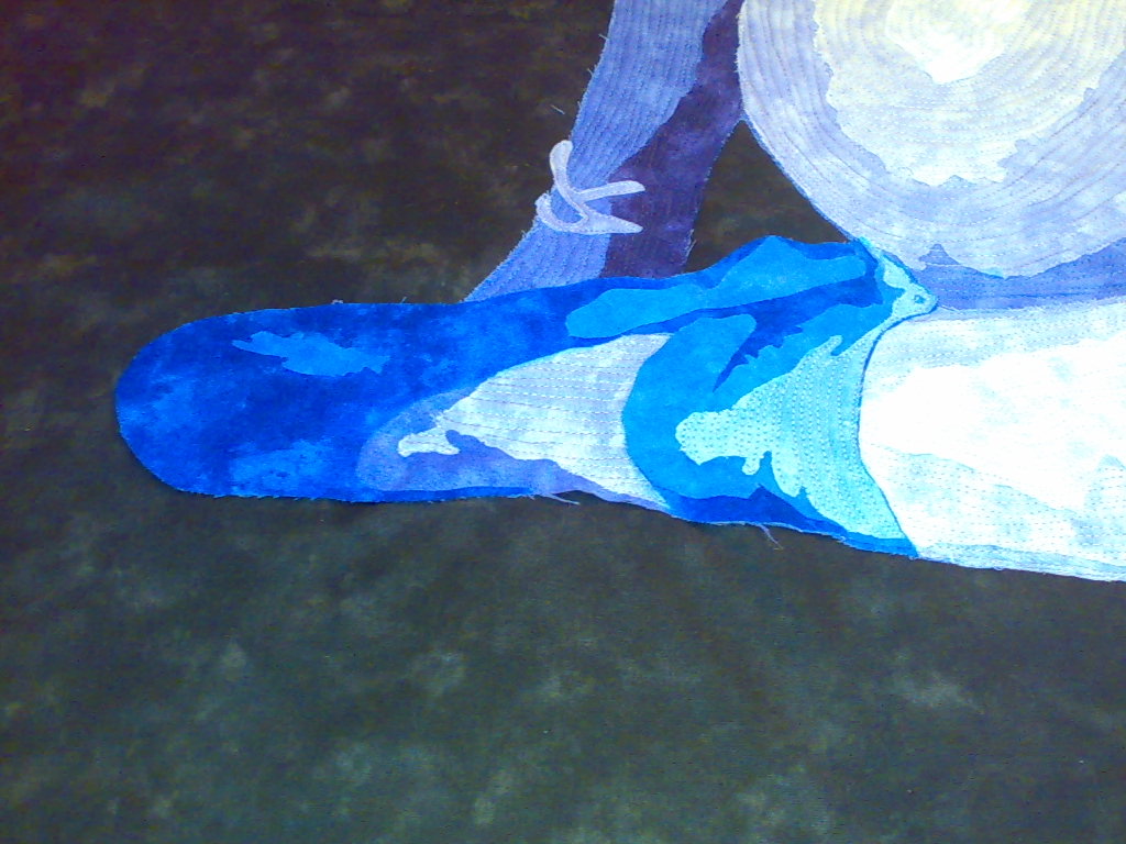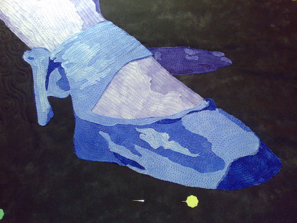 I really enjoyed working on the shoes I think the quilting probably adds more to them than any area other than the hair. Suddenly you can see the ribbons and the curves of the feet. In this picture you can also see that the background quilting has more or less kept pace with the rest of the quilt and in the one below why that is so important.