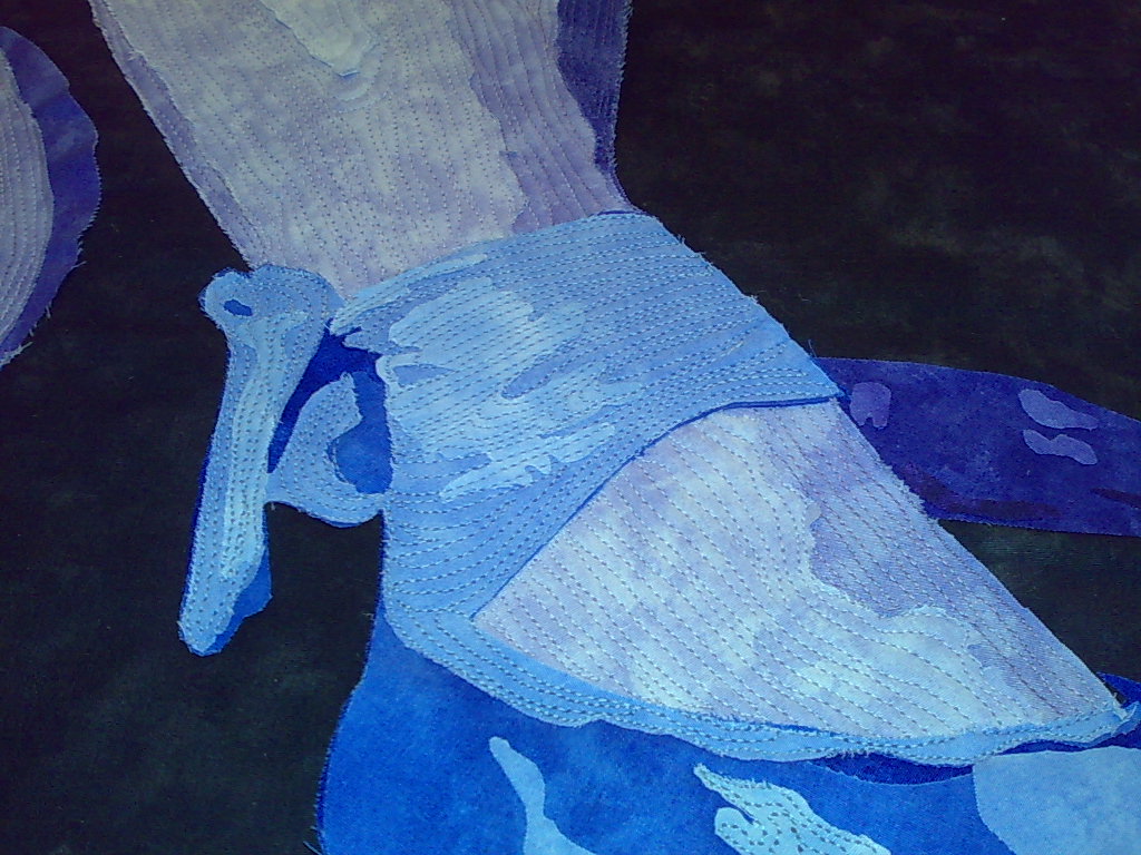 If you remember last time I showed the top of this thigh I had paused my quilting to add some more detail to the arm behind it. Now you can see what I meant. There is a shadow on the arm and her bracelet. Pausing when I did just made for a tidier edge. When I was working on the lower legs I also made use of the thread to do the feet. It saved a couple of thread changes at least. One of the downsides of doing this sort of work (and especially the way I approach it) is the number of thread changes. It’s surprising how much time and thread that eats up.