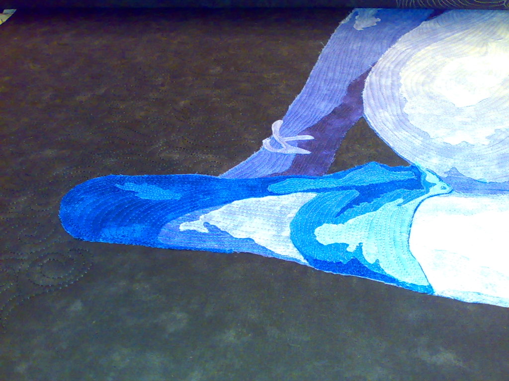 I really enjoyed working on the shoes I think the quilting probably adds more to them than any area other than the hair. Suddenly you can see the ribbons and the curves of the feet. In this picture you can also see that the background quilting has more or less kept pace with the rest of the quilt and in the one below why that is so important.