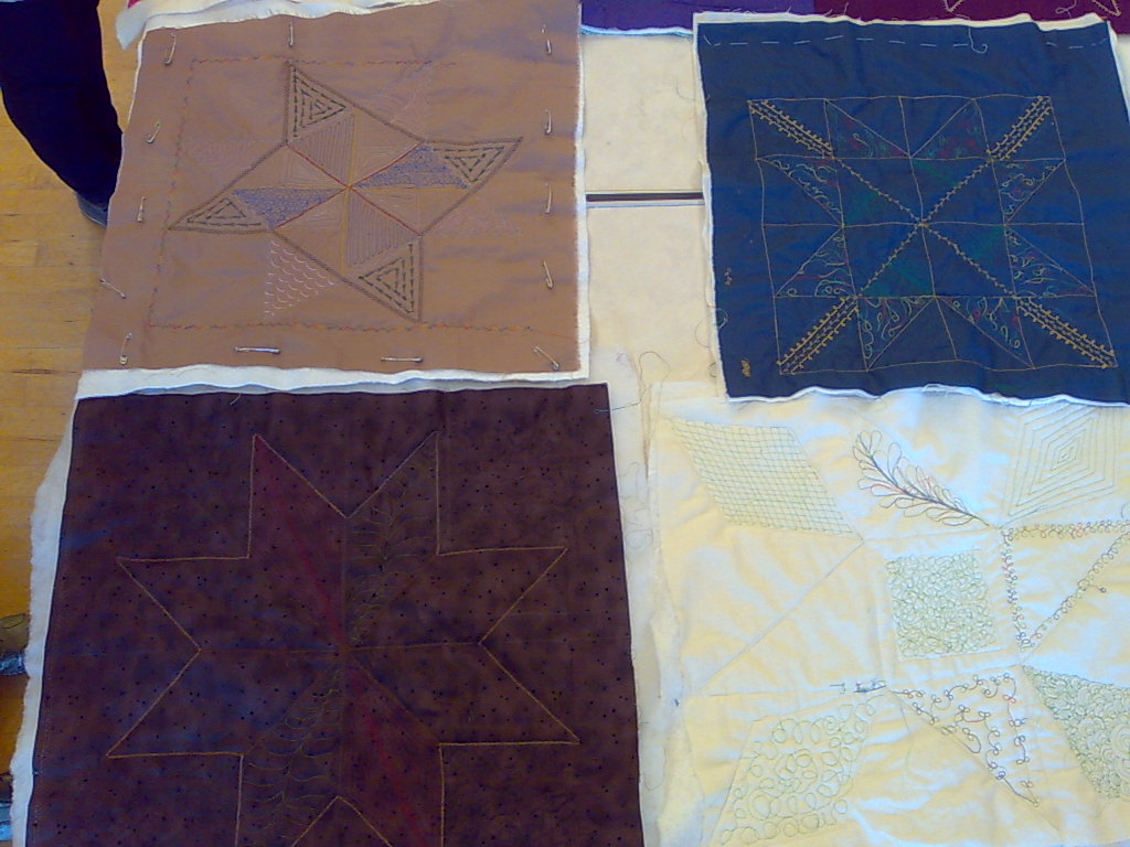 Well here are some pictures of how far people got with their wholecloths in the workshop today. I hope the quilting will show up and I am sorry if I've missed anyone, it's hard to see exactly what I am doing on my phone. A couple of these little quilts are actually finished which is great and several more are very close to completion. As you can see there were many different approaches used during the day and some very impressive quilting. One of the purple quilts has feathers quilted in metalic thread on it. Imressive? Very, but more so when you find out it was her first attempt at feathers! Just goes to show what can be achieved if you just got for it, I don't know if she believes how cool that is yet.I guess it's time for bed for me as tomorrow I am back with Oast Quilters teaching advanced machine quilting. Night night.