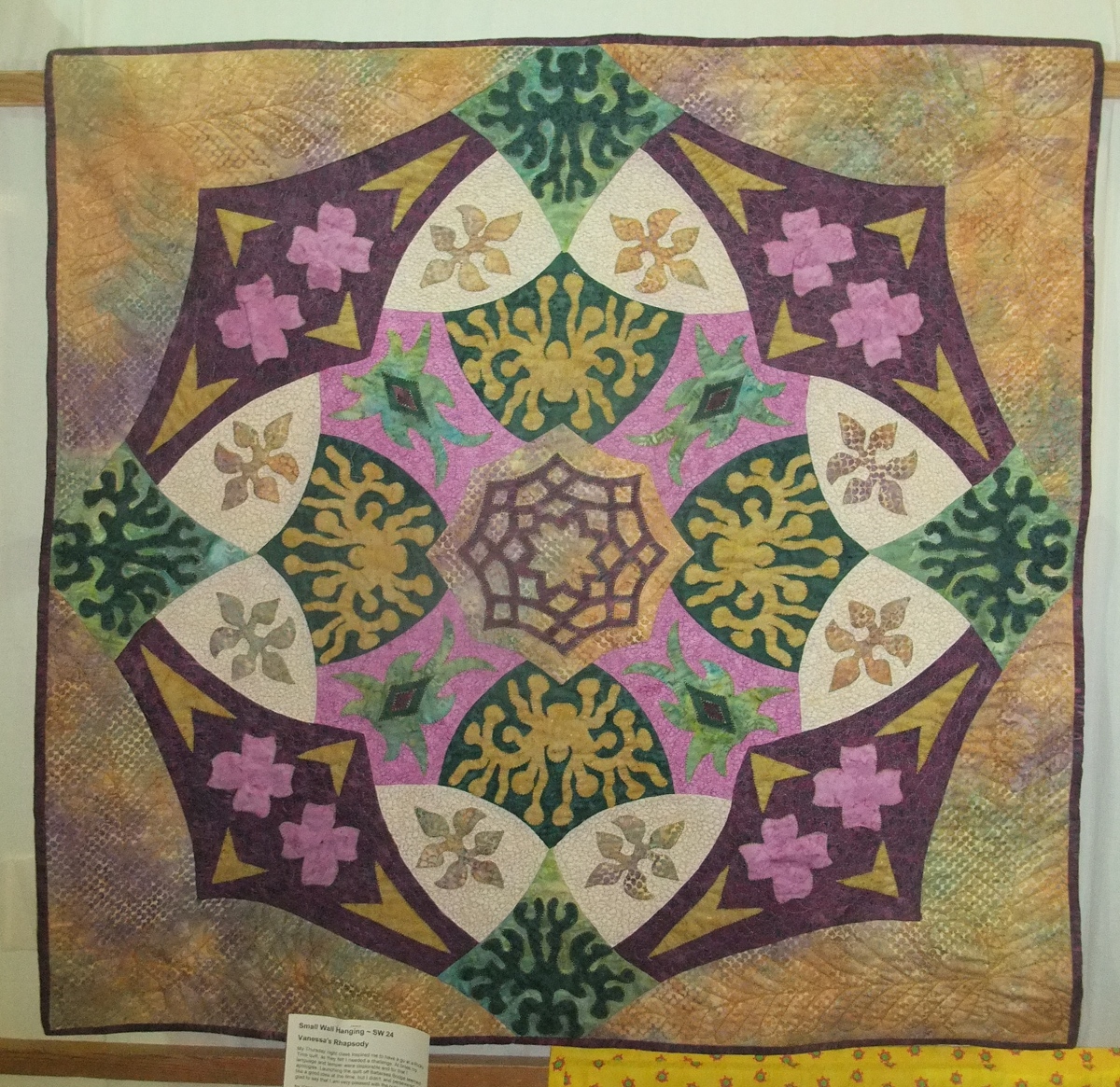 Lastly (by bloggers choice remember) is “Vanessa’s Rhapsody”. I don’t think the photo really does justice to this and I might have to have a chat with Vanessa about getting a picture of the back. The thing that makes this quilt for me is the quilting, which isn’t showing as well as I would like. This was a real step out of her comfort zone, and at times quite a fight. We both learned a lot from this quilt. Never ever try to put bits of a rhapsody quilt together when you are already having bad day. Sewing the curves is fine when relaxed, when you aren’t it’s really hard. Vanessa also wasn’t sure about machine quilting when she started but has finished the quilt off with freehand feathers in the four background corners. This is a very special quilt it seems to have inspired not only Vanessa but other members of the group and it was great to see it in a show, if not as visible and well lit as I would have liked.