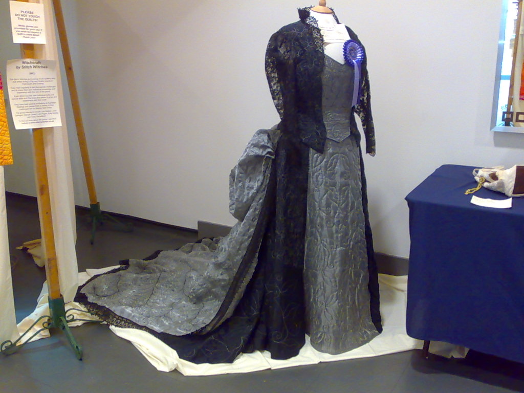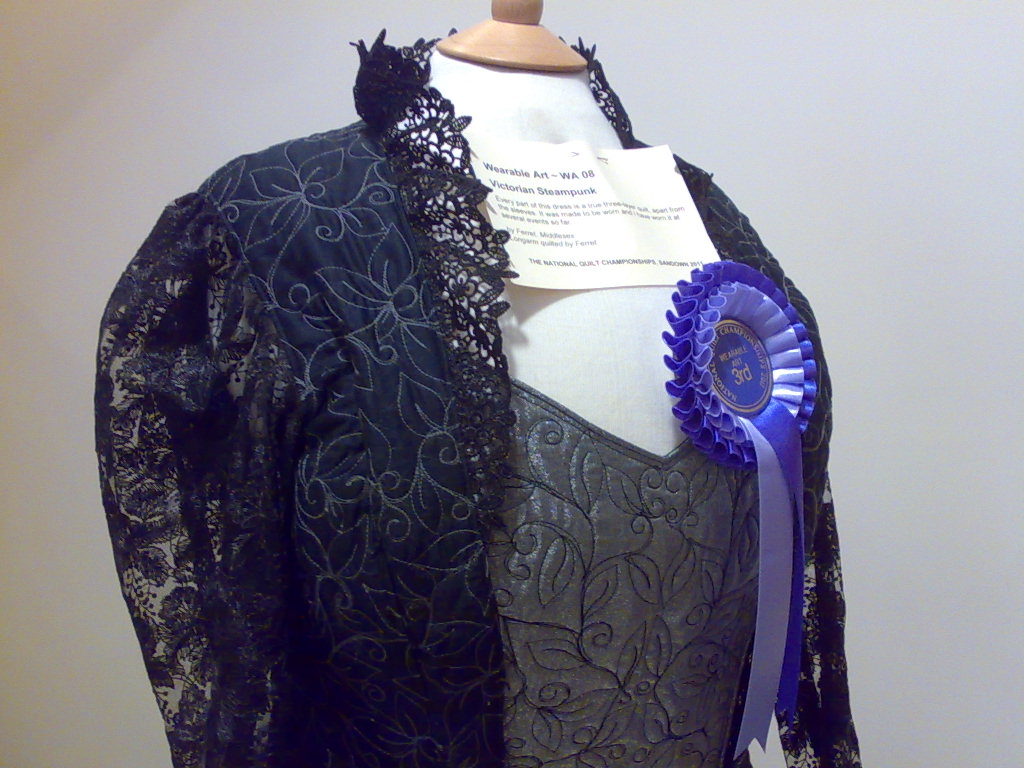 Sandown was fun at the weekend. The highlight for me was meeting up with two of my students on the Sunday. It was the first time they had entered the show and were there using the free tickets that you get for entering. For me the best part was watching them. It's great seeing your quilt hung, it's even better when other people photograph it. There is nothing like the feeling that your quilt has inspired a total stranger. If you've not tried it give it a go. There are plenty of smaller shows to chose from.My quilts did OK in the show. My three bed quilts and Tet's were hung in a row, our own mini gallery. The left most two each picked up Judges Merit awards. Given the quilts that won the category, I'm thrilled with that. I lost count of how many times I said that a lot has to do with who/what beats you. If you lose bed quilt or hand quilting to Sandy Lush you really can't take it too badly. One friend I looked at the show with was very upset that a bed quilt only got third, ditto the one that came second, then she saw the winner. Victorian Steampunk, my dress, was a but of a nightmare to deliver and display. I thnik the show did well given they needed to stop people standing on the train. Yes it would have been lovely to have it in a position where people could walk right around it, but that really wasn't possible at that venue. The dress collected third place in wearable art.