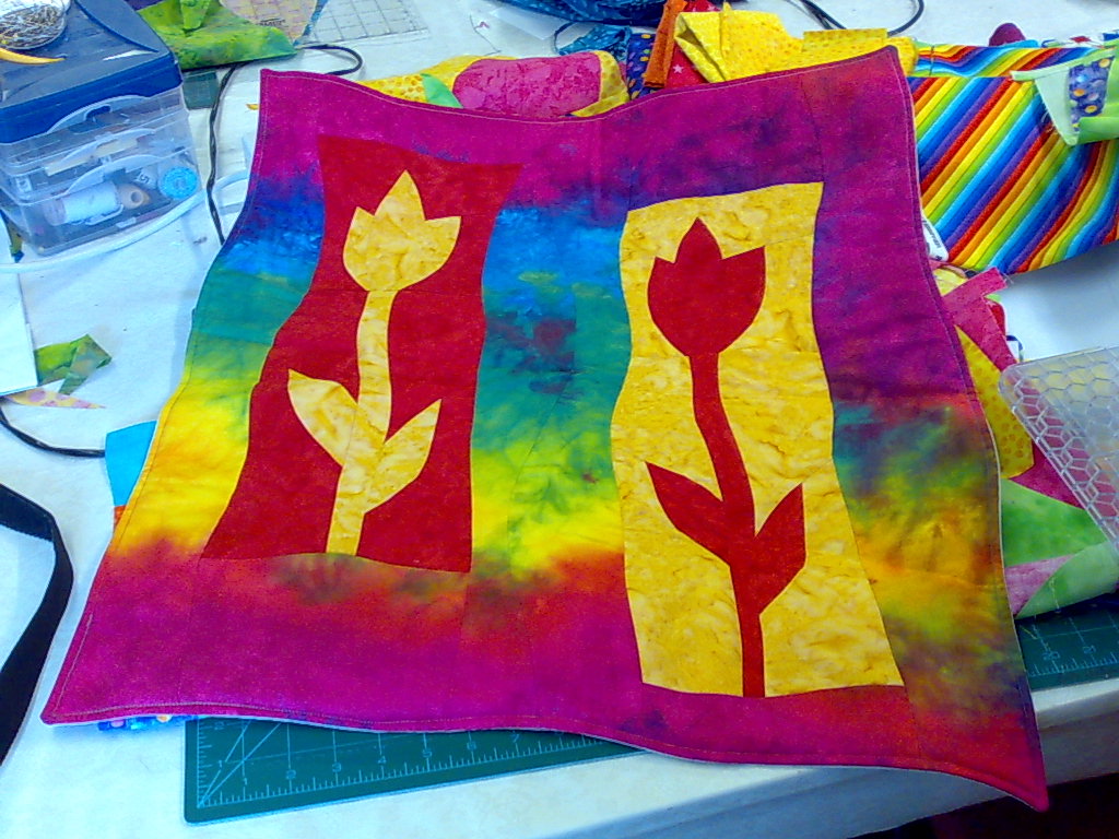 I've finally got a few minutes to share some more pictures from the class this weekend. I decided to wait till I got home so I could share more pictures. Posting from Ireland on my phone is quite pricey. I have so many pictures I can't possibly post them all so I've grabbed a few at random. Sorry if they are blurry or anything I've only got a very small image to judge them by. Each time I get to teach a multi day class it reminds me how much I enjoy it. You can get so much more done. It seems that quilting every day keeps the new technique fresh in your mind so two consecutive days seems to be about the same as three spaced out days. The Sunday was spent playing with different designs using the same techniques as the tulips. We had sea horses, butterflys, dragonflys, ducks and Marys not to mention the other things that were designed but not made. I certainly enjoyed the day and I think the class did too. Of course when you experiment you do get some designs that don't work the way you expect, which then allows everyone to learn more. You can progress techniques so much faster when there are more people playing.I flew home Monday night after being fed solidly so I wouldn't starve on the journey. I think my main memory of Ireland from both trips is the food. You do get very well fed and the food is solid proper food. Heathrow was the usual unpleasant shock. Suddenly no on can understand a word I say and even ordering a coffee was hard work. By the time I got home I was exhausted, and yesterdays talk was hard work after the 4 days in Ireland, but more on that later.
