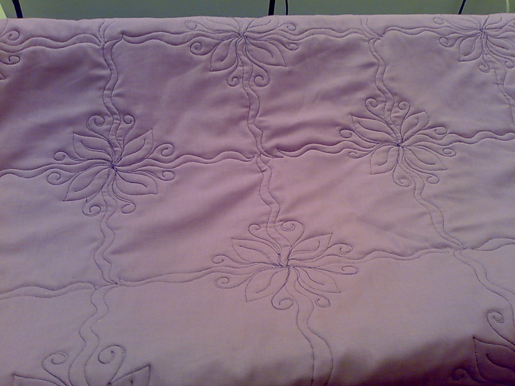 I'll ask Jane for a picture of the front. It's just two fabrics, where I have quilted it is dark purple and the bit's I missed are all a very busy oriental print of fans.