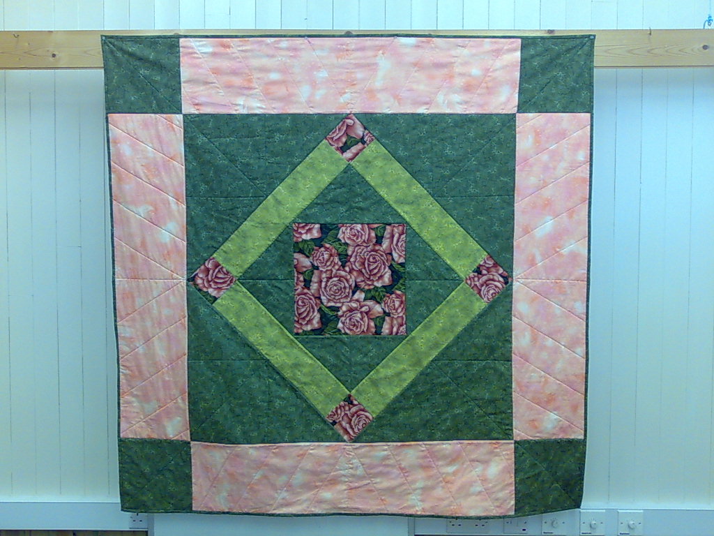 Last things first one of my students from last weeks speed quilt class brought her finished quilt in today. The pictures show the front and the back or the quilt. It's come out well hasn't it? The other picture shows the shelves in my storage room. I went fabric shopping at the weekend and to make space for the new fabric I had to tidy up. I have had to evict some of my wadding to the storage unit but now I can get to my fabric. I love the way shelves full of fabric look.Monday the weather held off enough for me to get to my next frame quilting lesson. Two more ladies have discovered the joy of freehand quilting. I love spreading the fun of quilting.