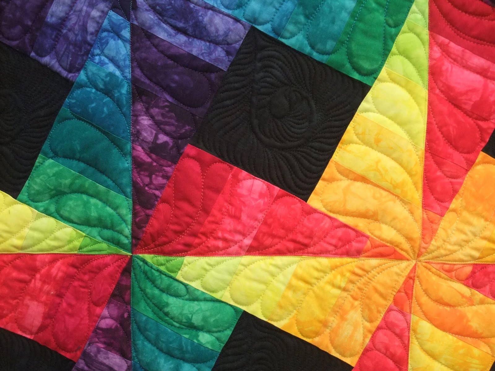 Everywhere I have black fabric there was supposed to be a raspberry fabric. I only had the correct amout of that so I couldn’t use it (it is in the binding of the quilt). I thought balck would make the colours really pop and I had a lovely batik that would suit the hand dyed fabrics. The internal sashing bars are about twice as wide as they should have been, as is the narrow black border. The quilt should have ended there. Fortunately there were enough scraps of the bright fabrics to make another narrow border, then I was able to add another wide black one. I think the coloured strip stops the quilt looking too much like it has been extended. Without it the outer border would have been huge.