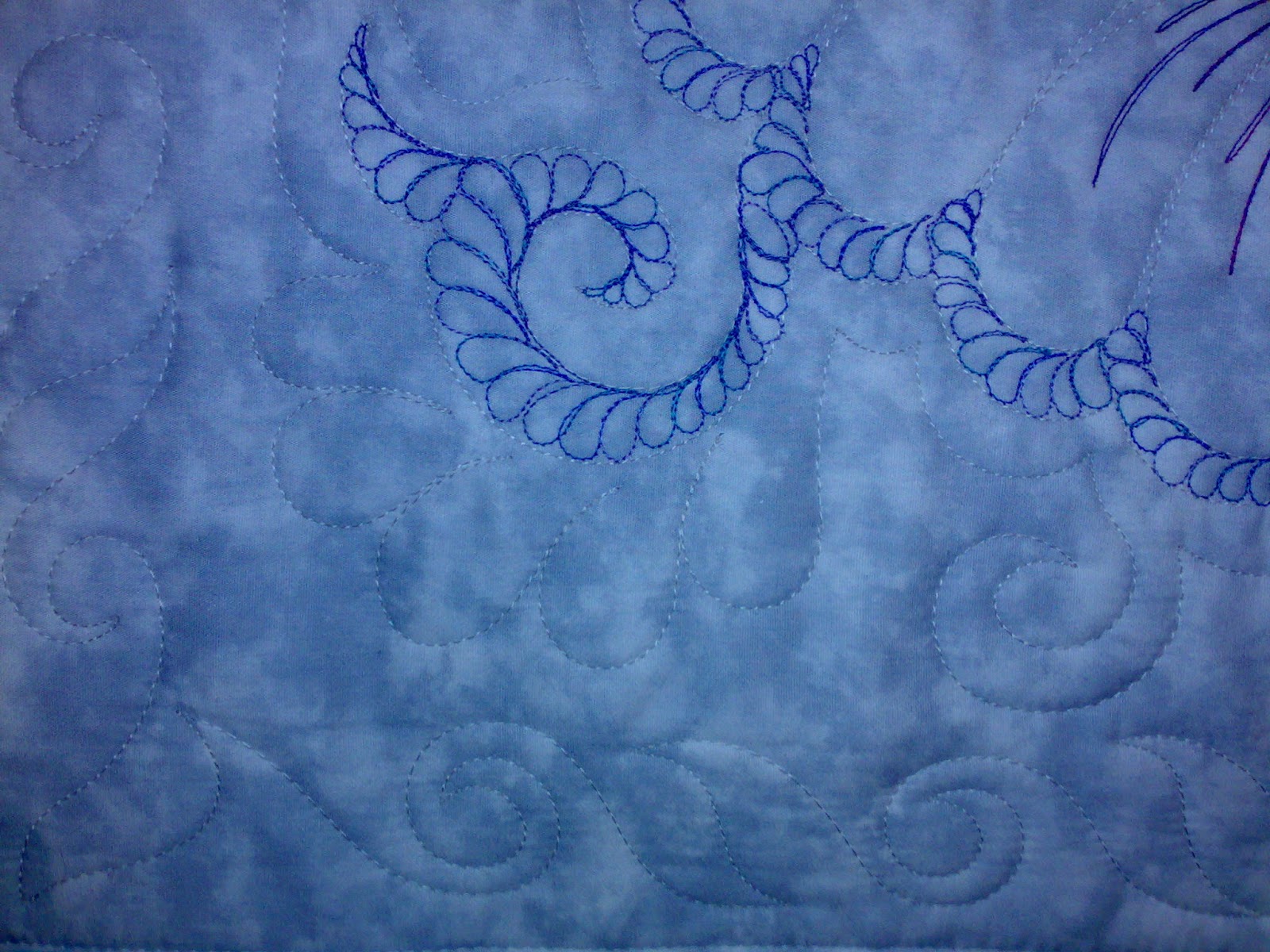 The photographs actually probably give you a better idea of the shading of the fabric than you get in real life. There are places on the quilt where the thread changes the colour you see a lot, interestingly the camera picks up the background colour more.
