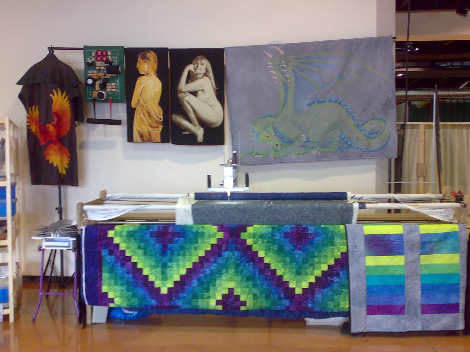 It's getting there. My machine is up and running (I am working on a couple more of the wholecloth blanks). I've got an amazing space I just hope I can do it justice. Can't wait to see you all. Oh apparently the beast was OK to hang and looks good. They are still judging to I haven't seen it yet, but I'm pleased they are pleased.