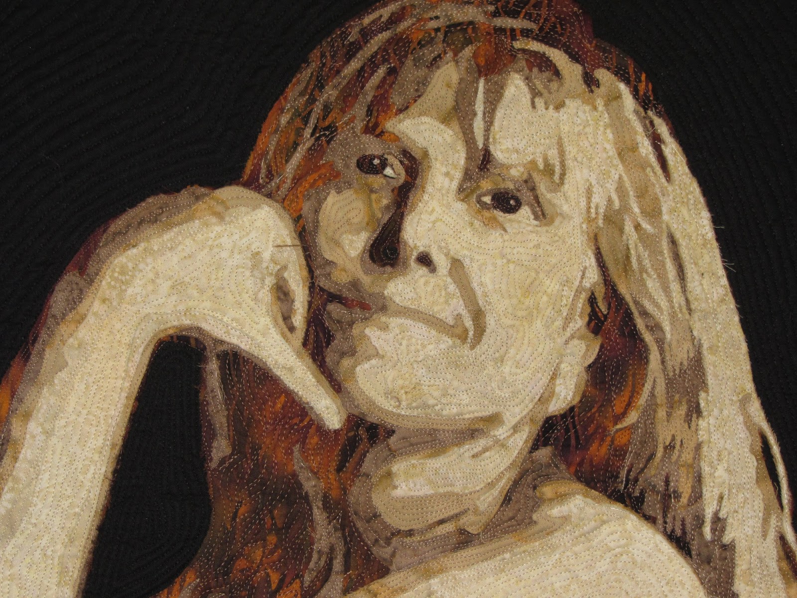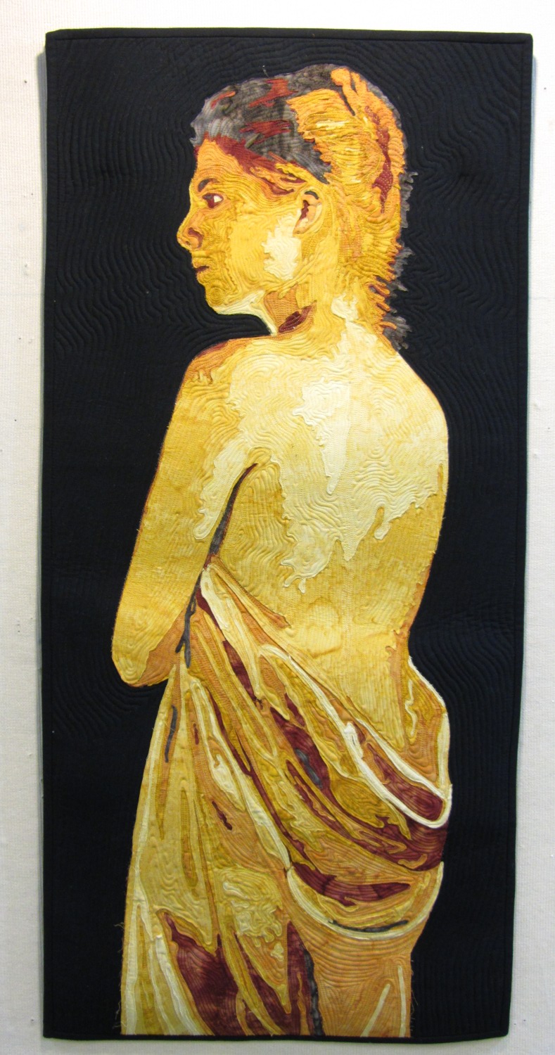 Carrying on our tour around the gallery we come to this set of three figure quilts. The middle one is the newest of my nudes, but more on her in a moment. The first of the three quilt is called Mother. It’s not been to that many shows but has probably been seen by more people than most of my other quilts. This one got a write up in Quilters Home magazine because it depicts a very well known quilter. When Bonnie McCaffery first said how much she liked my quilts I was thrilled and when she said she would have been proud to have posed for one of them I saw an opportunity. It was a few years later when, desperate for another quilt for my gallery at the Festival of Quilts, that I finally persuaded her to model for me. When I got the photos by email (yes I have to check all that spam claiming to be nude photos for me) this one stood out. It was taken by her daughter and I think the expression is perfect, and her hair is looking great in it too. I love quilting hair and that had been part of the attraction of using her as a model.