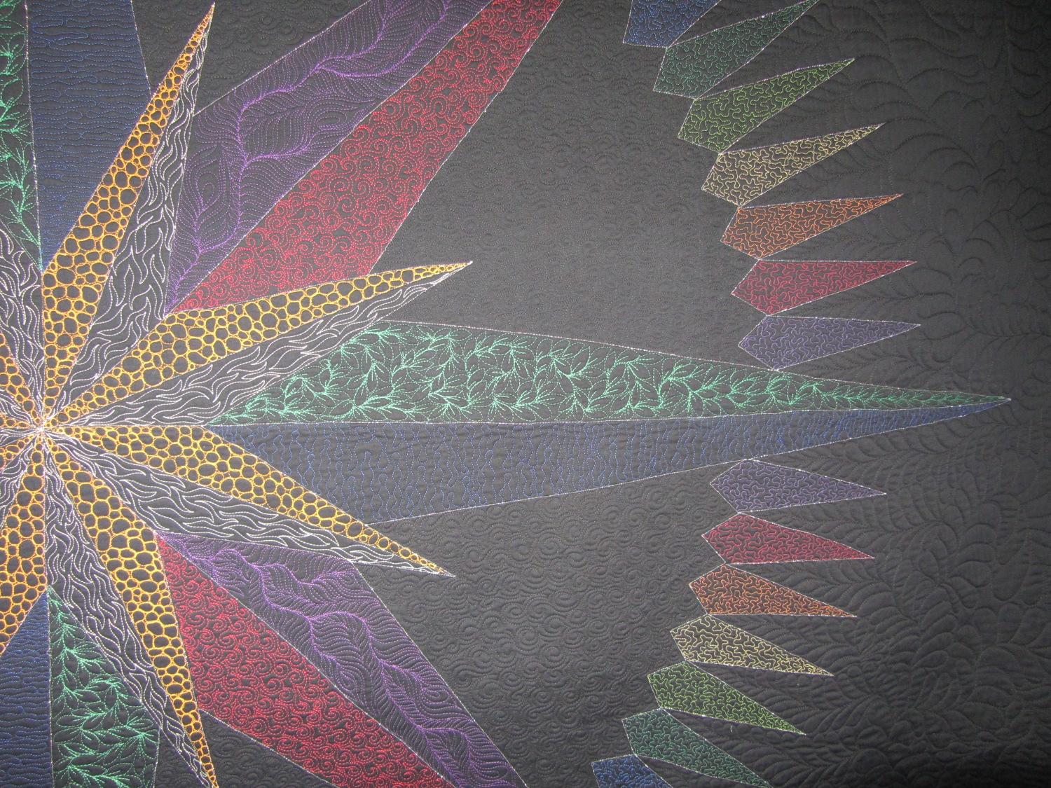 Guide Me may look like a pieced quilt but it isn’t. It is one piece of black cotton sateen with the design being made in coloured threads. The straight lines of this quilt were marked and then sewn with silver thread, but all the rest of the quilting is freehand. This is a design I had planned to piece, well actually I still do intend to make it as a pieced quilt but it seemed a lot quicker and easier to make it as a wholecloth. I was almost right. I learned an awful lot from this quilt. I had to make 2 complete quilts and even on the second one I got to do 12 hours unquilting. I got one of the sets of green leaves in to the space for blue waves. it had only taken 12 minutes to quilt it in. I’ve got better at unpicking since then. I could probably undo it in 8 hours now!