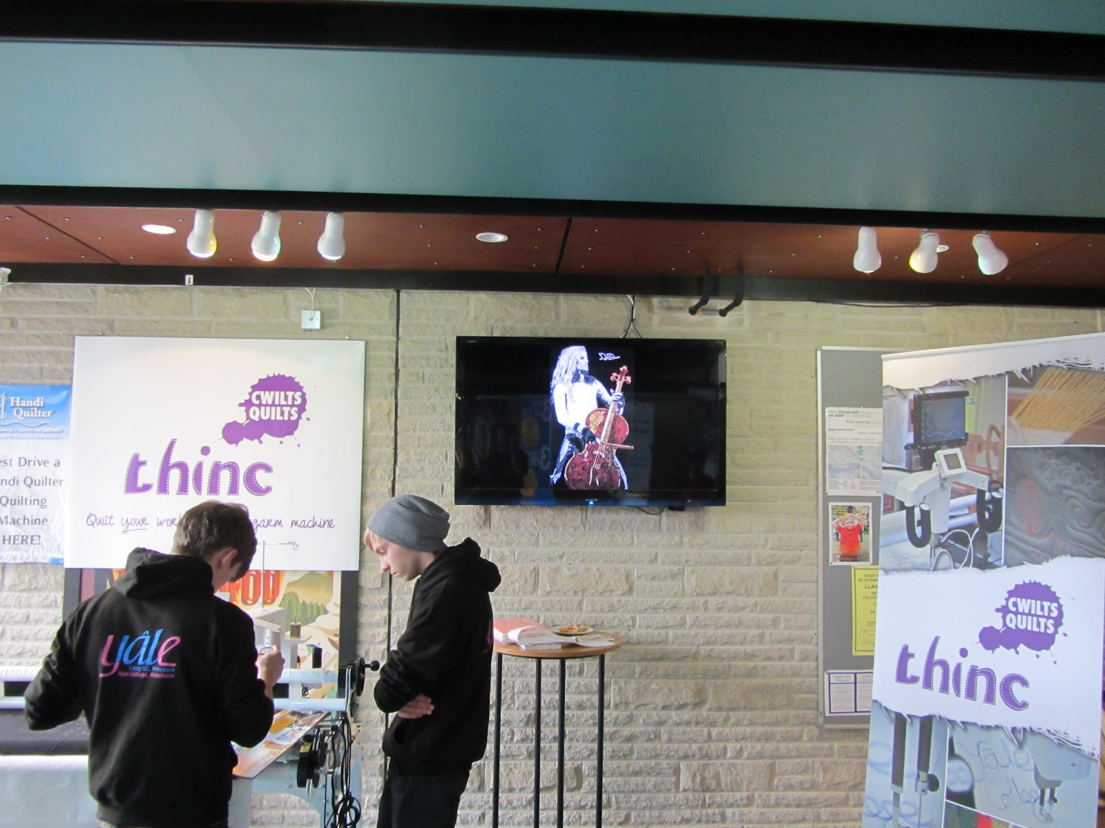 Terri who works at the venue and has been looking after us during our stay offered us use of the screen in the lobby for the day if we could put some pictures onto a USB stick. That wasn’t an offer we were going to pass on so Tet got to work and just after opening a slide show was up of the quilts in my gallery. I didn’t actually manage to get to the lobby and see it, but I’ve heard from people who did and they seemed to like it, so ti was worth the effort. Unfortunately because I was busy on the gallery I also didn’t get to meet the students from Yale Collage, the two guys in the photo. I’d have liked to have found out what sort of things they had been working on but it wasn’t to be. They didn’t get a chance to see the gallery during the day though I am told the did spend a lot of time watching the slide show. Maybe I should have sent some one to tell them the real thing was just in the next room ![]()