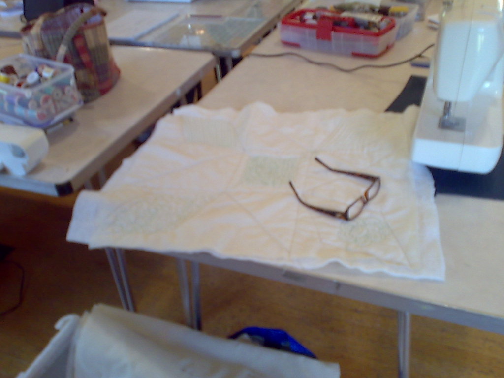 Apparently I need to rename this class (hence the question mark above) the word is too scary for the actual class. I guess it will become machine quilting 2. I've only posted the clearest of the photos so you will just have to believe me the rest are great too. Some beginners weren't put off by the title and they did well. Often the less people know about the subject the better they get on. It probably means they have less to unlearn. I didn't take an overview picture but when all the samples were spread out on the floor there was an impressive amount of quilting. Bear in mind there is also a lot of talking (and time for another very nice lunch) and you will appreciate how much everyone got done within the class. A couple of students fount that the 1m square sample piece wasn't really quite big enough for them. I had a great time with this group over the weekend and I hope I will get to meet up with them again soon.Today it turns out I have a bonus day at home, well at least in theory. I thought I would start by going to the storage unit to unload the van. It seemed like a good idea at the time. Unfortunately by the time I got home the world and his wife had filled not only my road but all the surrounding ones, so it feels very much like I am still on the road. I've ended up at shopping center with free parking and I'm sitting in a burger bar. Nothing new there. Hopefully I will get home at a civilised time and be able to check my phone messages and answer email, but I'm not going to count on it.