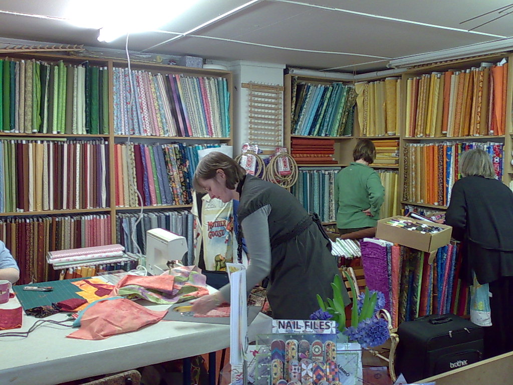 To catch up. Things are starting to calm down and I am getting some time in the evenings for a couple of days. The pictures are from last weeks workshop at Country Threads in Bath. It's my second trip there and was just as much fun as the first one. This time I was teaching Journal Covers. The first one finished was the beginner of the group. It often happens with this particular workshop and amuses me greatly. I had thought I might have some time in Bath this trip but as I mentioned in my last post I was going to a concert on the Sunday. I did however make time for a little fabric shopping.Monday I was teaching machine quilting in Kent. Unfortunately not a class that lends itself to interesting pictures. Other than my student not being what I wouldcall beginners it was a good day. I think everyone found some useful information and a quilting design they could play with. Thinking about it, perhaps I should have photographed their before work, some of it was really very good.Tonight I am on a farm in Norfolk, but I will tell you about that tomorrow.