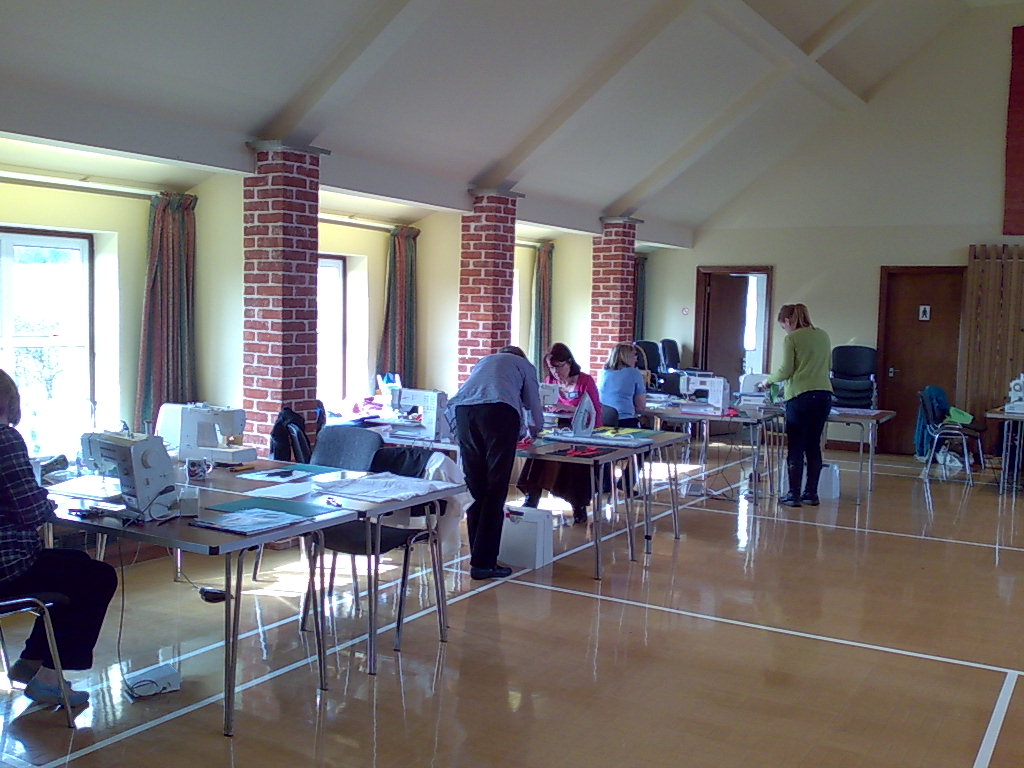 I'm tired but we are having fun. I'm still in the workshop at the Limerick Quilt Centre and sewing is happening. I didn't bring a project with me so I get to blog. When they finally got the doors open unloading the plane was very quick and in no time I was whisked away to Limerick. My host took me the scenic route and then out for a walk. The pictures of the river are of the Claire Glenns a local tourist spot. The photos don't do it justice. The water is fast flowing and the sound is amazing. It was quite wet and muddy but mostly I stayed clean enough to look professional.After a very nice dinner we went to the hall. The talk was in a church which might have been tricky with my big talk but it was perfect for the 20kg version. To save weight I took my coat and to go with it I thought the dress would go well with it. As the dummy was too big to bring I decided to wear it for the talk. It worked very well actually especially as the heating was broken. I think I got the best deal. The talk seemed to work very well despite just being chosen for weight, and the group were lovely. As we were packing up the alarm went off. We assumed it was a burgler alarm, but no, it ws the fire alarm. Everyone checked for fire while I packed and left. There wasn't actually a fire but I appreciated the care they took and that they let me get on with packing.