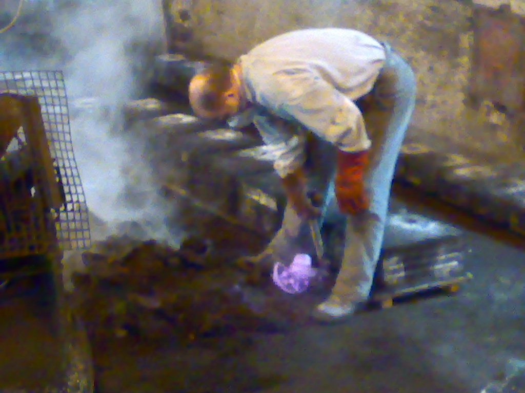 After the walk I headed back to the foundry where they were unmoulding the castings. To do that they grab the mould by the wooden base and fling the sand and casting onto a heap of sand. Then you dig for your casting, with a hammer. Hitting the casting scatters the sand very quickly then you can retrieve the item. Most of them weren’t as hot as the one in the picture, but of course that meant they didn’t show as well in the photo. This one is a bell door stop. To separate items that are moulded in pairs the casting is dropped on the floor. I was surprised that it only ever seemed to break where they wanted it to. I guess it must sometimes go wrong, but not often enough to merit spending longer on separating the parts. Yes I did buy a few pieces while I was there. It’s surprising how cheap they are.