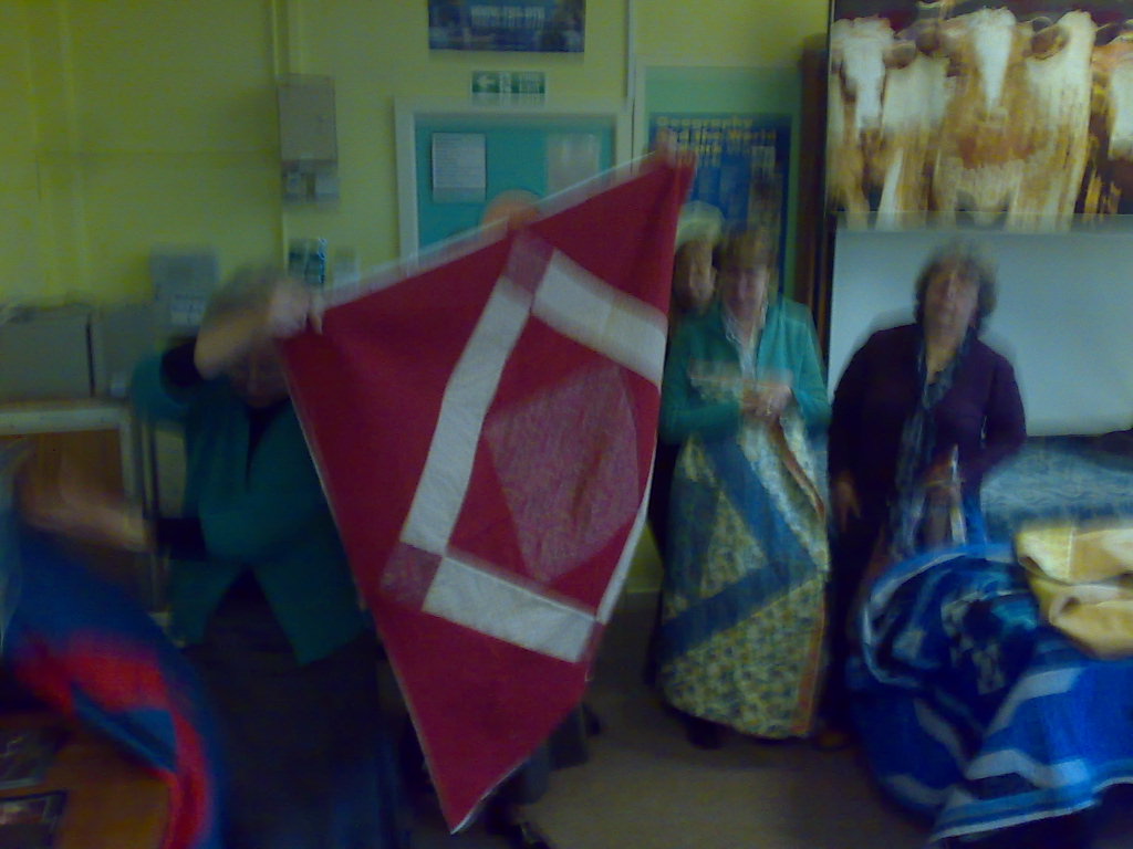 After being plied with coffee, dinner, a private quilt show and a dog (a very very handsome dog) we headed for the venue for the talk. Typically after saying how important parking was at a venue, the whole county had decided to park in the area, but after a bit of shuffling back and forth (with all the really heavy stuff) a space did free up close to the venue which made reloading a lot easier. Setting up was a giggle, largely due to the number of friendly faces in the audience. Lots of the ladies from Leominster had made good on their promise and come for the talk, and were keen to help wherever they could. I don’t know if I was on form or if it was just the perfect audience for me, but the talk seemed to go down very well with a lot of laughs and groans in all the right places. I think I need to take this group with me to lead the other audiences. On the other hand perhaps they should worry that they share my sense of humour. I should also say they make them tough here, my helper made it though the talk without flagging and trust me, some of the last quilts in the talk are heavy.