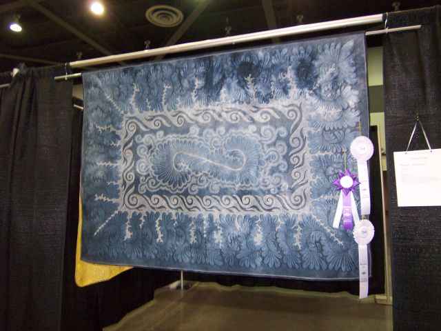 It's been a busy week for me and a bit of a shock to the system. The day before term started for my regular classes I taught Autumn Leaves at Patchwork Corner. It was fun and although we were missing one student, hope you get well soon, we had a lot of fun and the projects came on well. I am looking forward to seeing them finished.Wednesday , was the first day of term and as usual it was busy. Everyone was starting new things and even most of the people in the middle of projects had saved problems to bring to class. It was tiring, but quite fun really. There were new students, and old students returning, so lots of new names to remember too. One of my returning students brought in a copy of the new British Patchwork and Quilting magazine. It has a teaser report on the Festival of Quilts including pictures of some of my garments and of me and Linzi with the dueling longarms. I got home Wednesday to find a magazine waiting at home. It was the above copy of Popular Patchwork. That was exciting too. I knew it was time for the final part of Davina's Stay at Home quilt. I was lucky enough to quilt one of her samples and this month is quilting. i am thrilled with the write up, and that she noticed a lot of the little details that I think make the difference. However while I was looking for that item I found Bad Rain. It made their review of the Festival. Given that I am still amazed at how well this is recieved by quilters, it's a huge thrill to see it in a magazine.Thursday I headed for Reading and a talk. It went really well and I had a lot of fun. My hosts were very welcoming and yes I am loving the DVD. Friday I was teaching some of the ladies from the group to make art quilts. It's quite a full class, there is a lot of information I need to get across in a day, but they all did very well. As ever I was amazed by the variety they achieved using the same patterns. I was also impressed with how much they got done and their willingness to give things a go. I hope I will see some pictures from them soon.I knew that Friday was the day the winners from Innovations were published. As I have two quilts there I thought I would check for results. Nothing. No results on the web and no email. Well so be it, I've seen previous winners, they are good so I wasn't that surprised. Imagine my shock this morning when I checked the APQS forum and found the picture of Nude with Rope above. I'm guessing that is a judged second place I'm not quite certain yet. I was rather pleased. The ideal mood to arrive at a talk. While I finished setting up Tet thought he would have a look at the picture, then he called me over. He said I hadn't looked properly, I thought he meant that it wasn't the award I thought. Nope he had found the picture of Greek Fossils! We think that has a judged third and a peer review ribbon. I can't quite believe it. Now I am in a lovely field in my van near Rugby. Tomorrow I am teaching Speed Quilts, I wonder if they will be ready for it